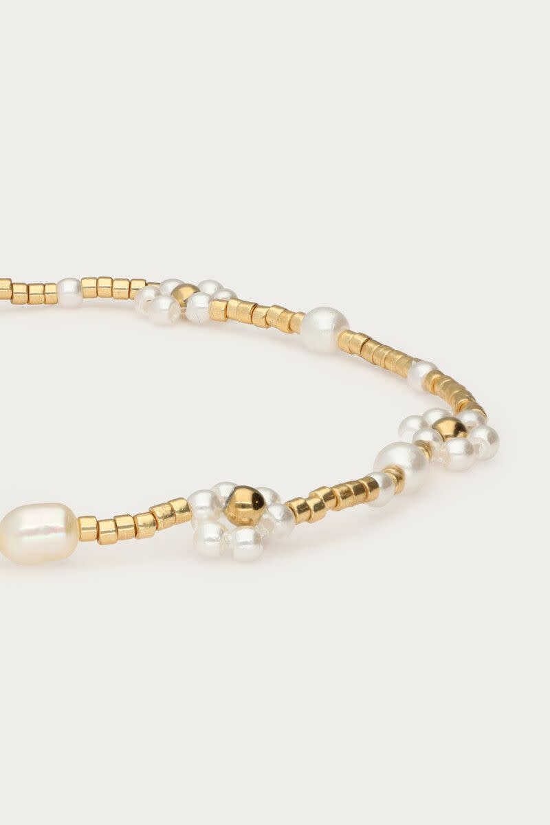 Botanical Elastieken Armband met Zoetwaterparel Bloemen Goud