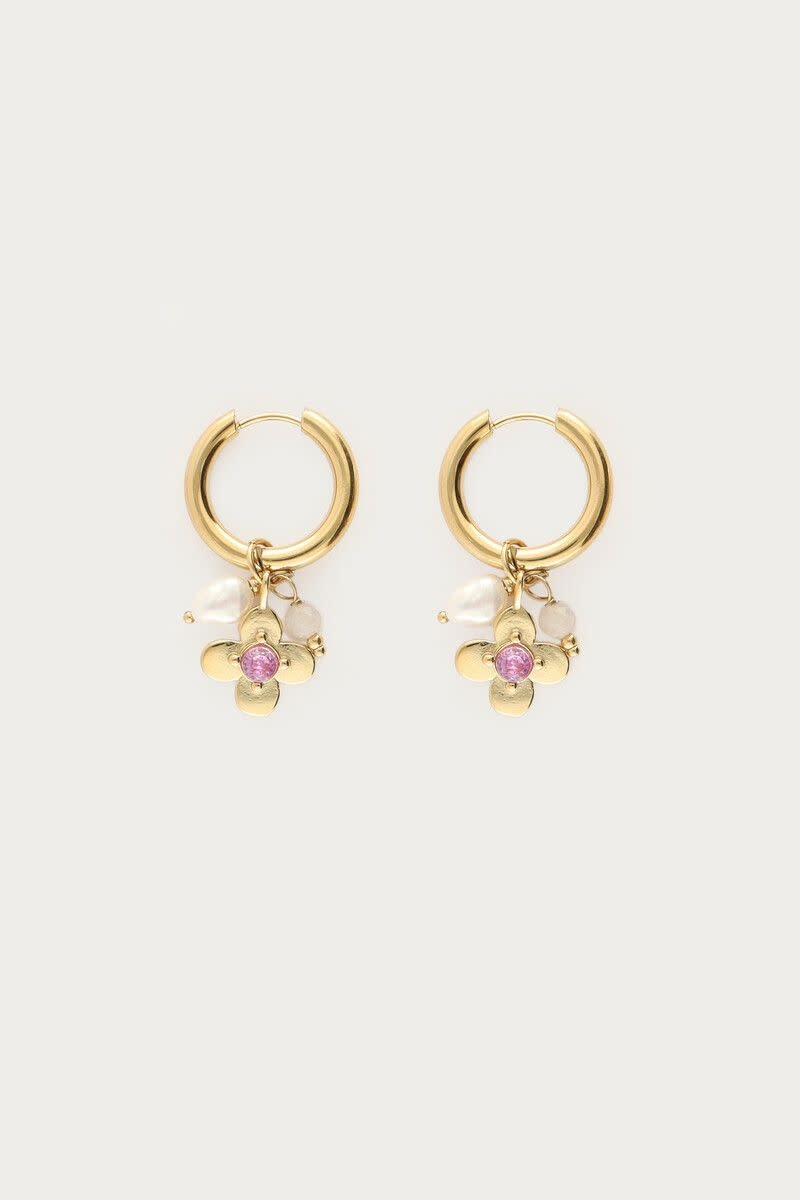 Botanical Statement Oorringen met Bloem en Roze Strass Steen Goud